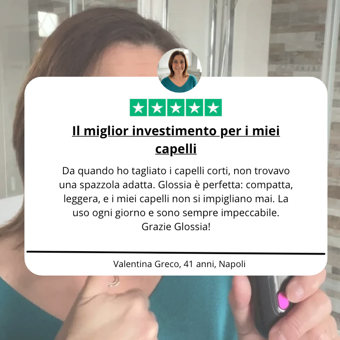 Con tre figli da preparare, non avevo mai tempo per me. Passavo 10 minuti a lottare con i miei capelli corti e finivo sempre frustrata. Con Glossia,in 2 minuti sono pronta. I miei capelli sono perfetti e io sono meno stressata. Le altre mamme mi chiedono come faccio!